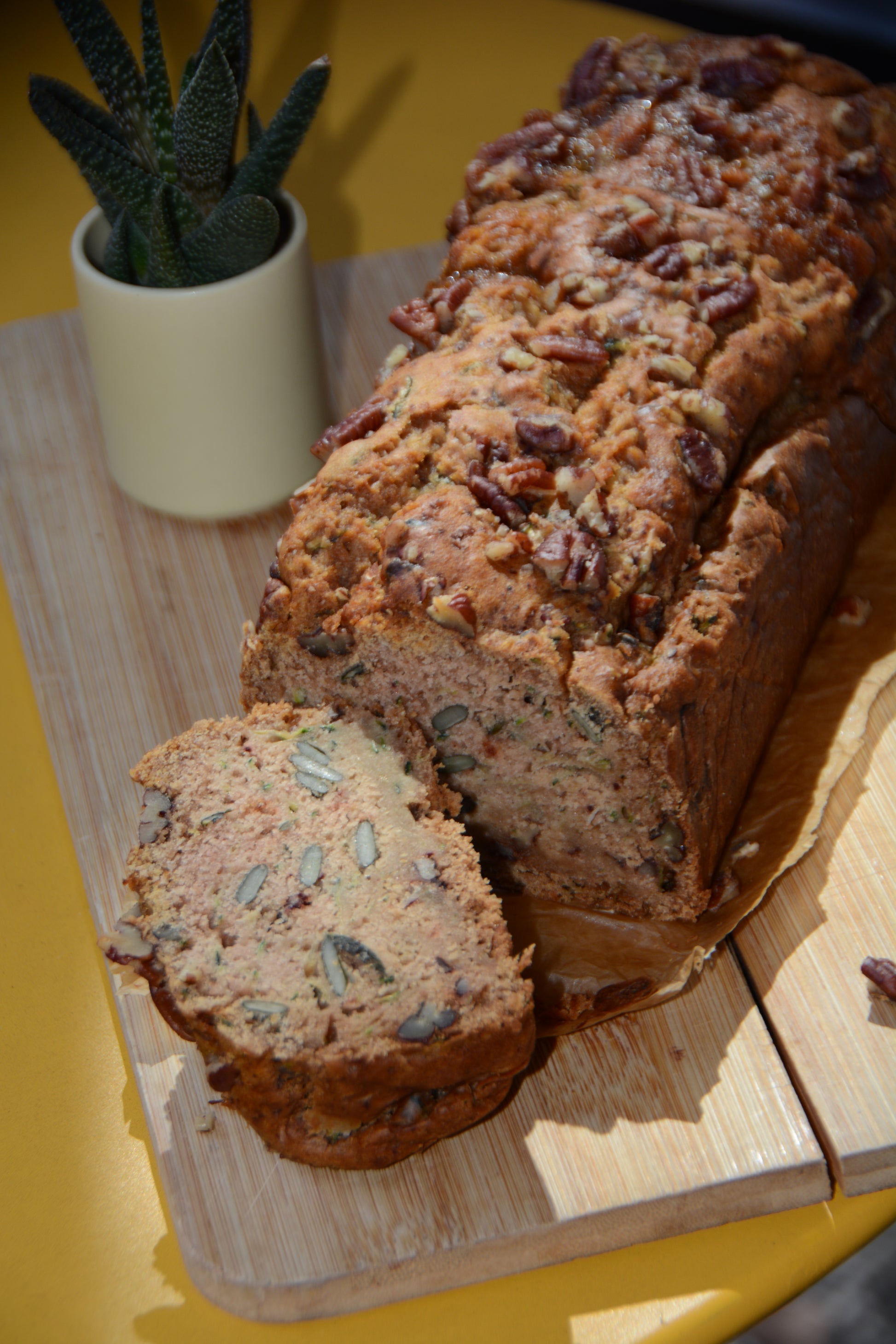 Un cake moelleux et pas très sucré, fait à base de courgettes, gingembre, noix de pecans et graines de courges.